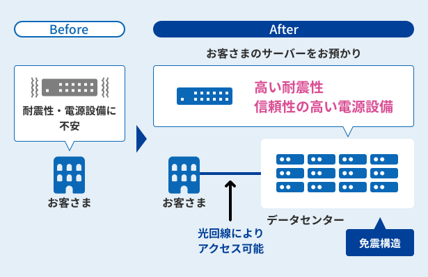 お客さまのサーバーやネットワーク機器などの重要な情報設備を、免震ビルでお預かりするサービスです。耐震性や電源設備、空調環境などに不安を抱えるお客さまに、安心してご利用いただける設備環境をご提供します。