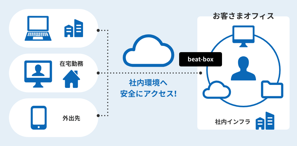 ご自宅、外出先、出先機関などから、インターネットに接続し、VPN接続でオフィスのシステムにアクセスすることが可能になります。