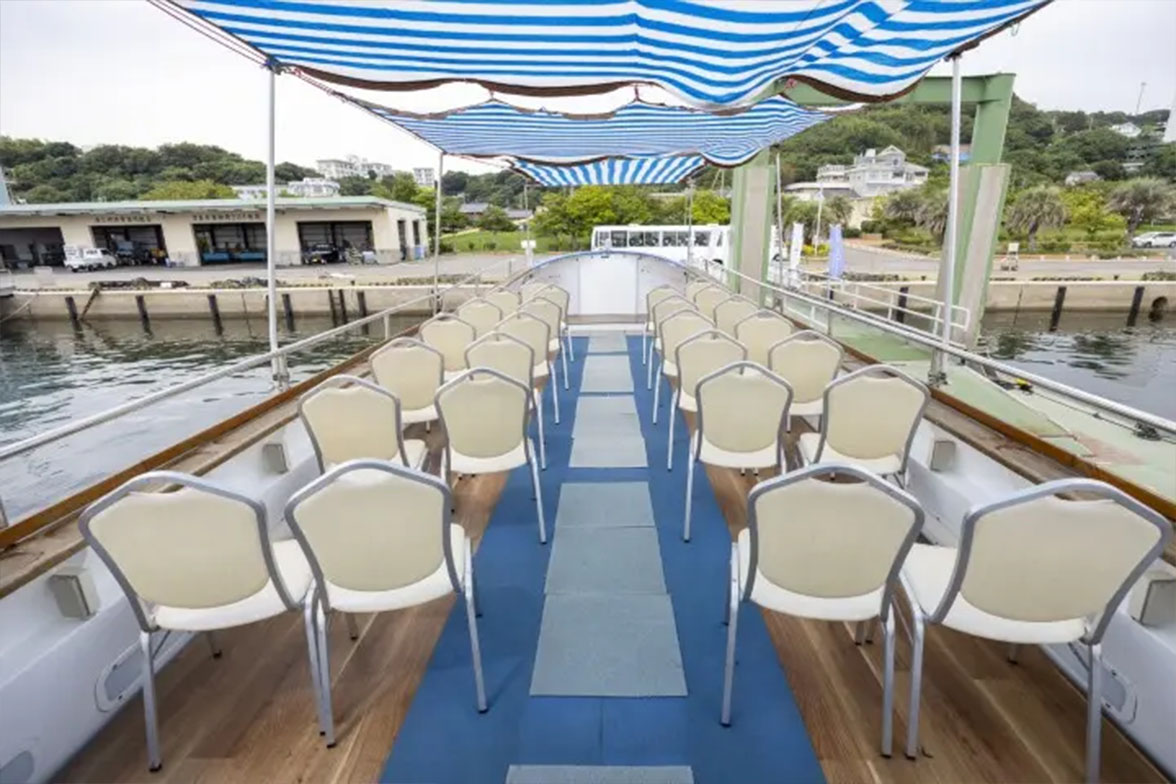 もうひとつのデッキには、潮風を感じながら三河湾を一望できる26席が用意されています。自然をダイレクトに楽しめるのもクルージングならではの楽しみ。せっかくなので外のデッキへ出て、心地よい風とともに三河湾の絶景を満喫することにしました!