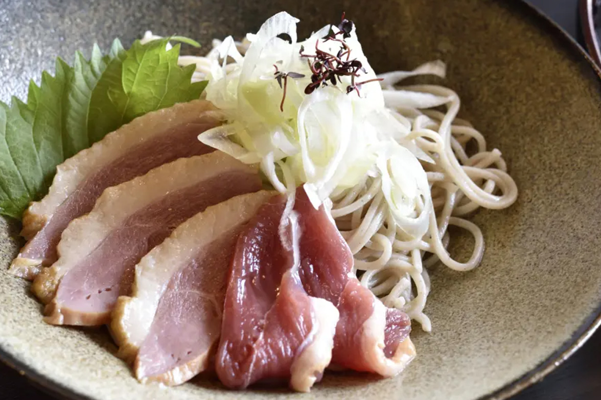 加熱した肉と生肉の二種が乗った鴨蕎麦セット。それぞれの歯ごたえや味わいの違いを比べる楽しさがあります。