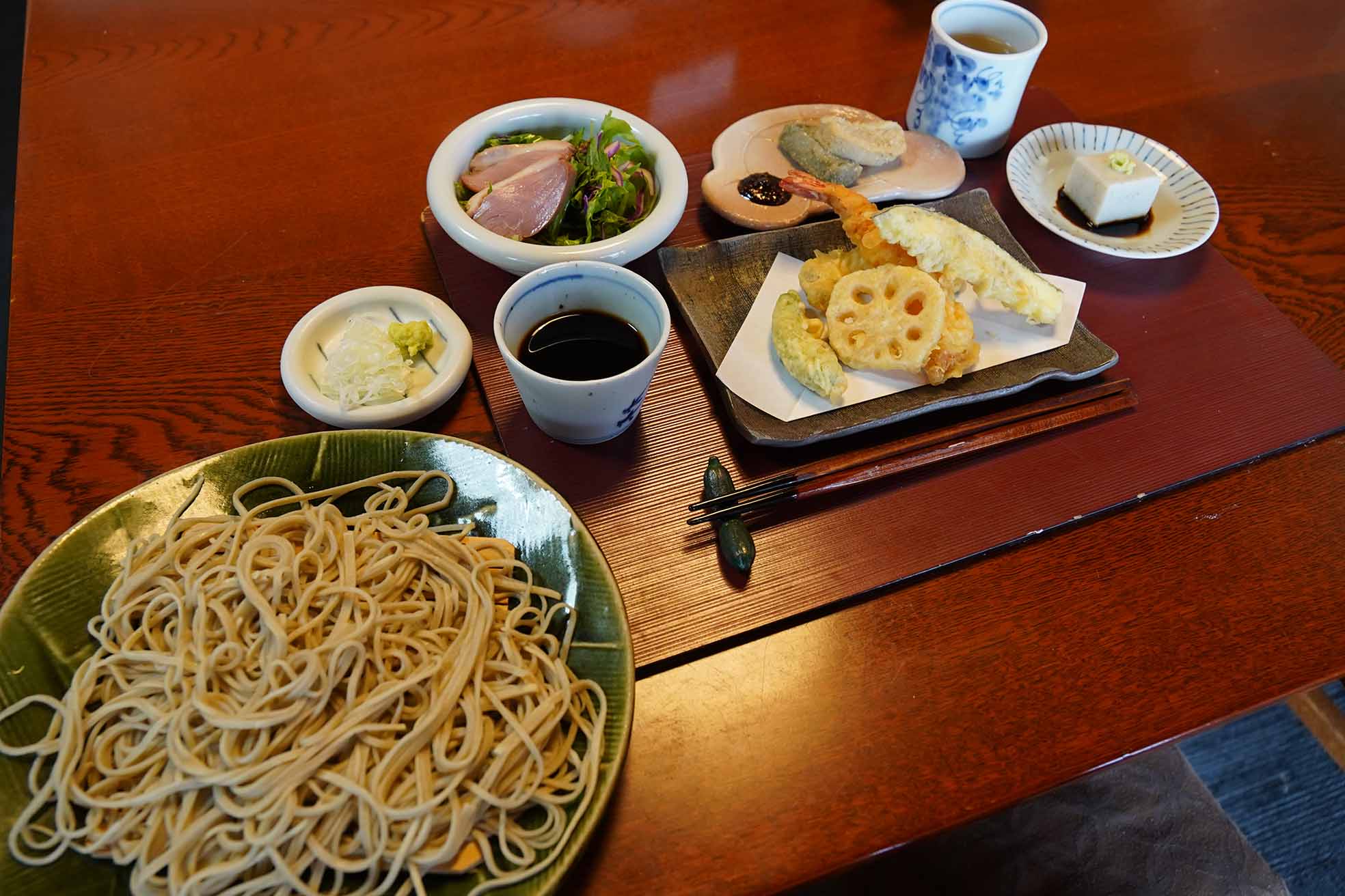 お昼膳は、サラダと蕎麦豆腐(右端)からはじまり、生麩(右奥)、天ぷら、メインの蕎麦がコース料理のように順番に登場し、最後に蕎麦アイスで〆です。順番に出てくるので、天ぷらも揚げたてで嬉しい~!