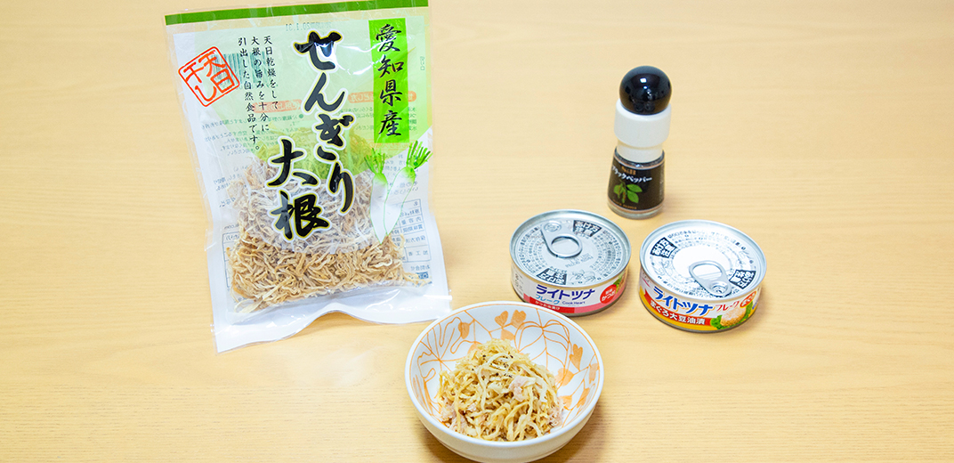 ここで、災害時にもおいしく食べられる「切り干し大根とツナのサラダ」をご紹介。缶詰のツナを1缶と、画像の切り干し大根を1袋(35g)合わせ、黒こしょうで味を調えます。水にさらしたり煮込んだりしていない分、シャキシャキとした歯ごたえと大根の甘みがいい感じ。ツナ缶の代わりにコーン缶でも。
