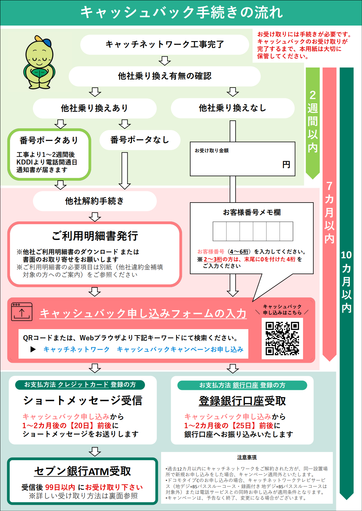 HOME お問い合わせ よくある質問 キャッシュバックの申し込み方法・受け取り方法・受け取り時期が知りたい キャッシュバックの申し込み方法・受け取り方法・受け取り時期が知りたい 文書番号:0305 お申し込み時、もしくは工事後のサポート対応時にお渡ししております『キャッシュバック手続きの流れ』をご参照ください。 以下の案内用紙をお渡ししております。 用紙を紛失された方は、キャッチネットワークまでお問い合わせください。 この情報は役に立ちましたか? はい いいえ 探していた内容ではなかった 送信 ご協力ありがとうございました。 いただいたご意見は今後のサイト運営に活用させていただきます。 関連Q&A セブン銀行ATMでのキャッシュバック受け取り方法がわからない キャッシュバックのショートメールが届かない 他社の解約金または撤去工事費を補填してもらうには、どの書類が必要ですか? よくある質問TOP