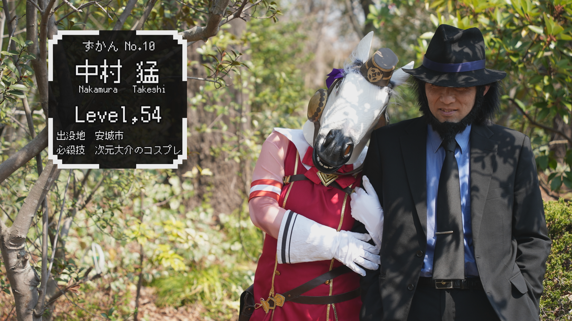 習 性 : 幼少期からアニメ好きで、20代からコスプレを始める。2005年には、家族で「ルパン三世」のキャラになりきり、コスプレ世界大会の本選に出場!自分の好きなアニメをみんなにも知ってほしいという思いでコスプレを楽しんでいる。最近のお気に入りのキャラクターは「異世界おじさん」。