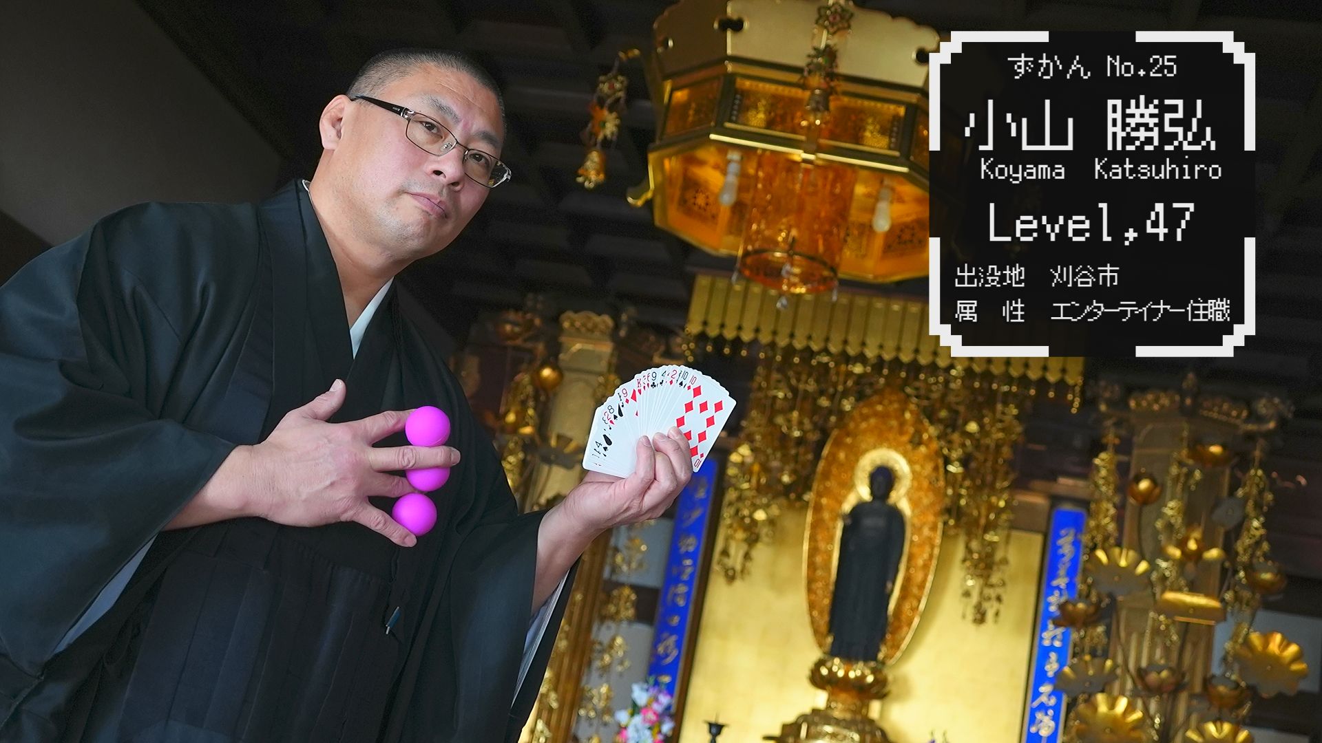 習 性 : 刈谷市元町にある実相寺の住職で、エンタメ精神溢れた住職として地域で親しまれている。元々はモテるためにと占いや手品を覚えたというが、現在は法事や説法の際に披露し地域住民の人気を集めている。開かれたお寺を目指し、地域にエンターテイメントを届ける。